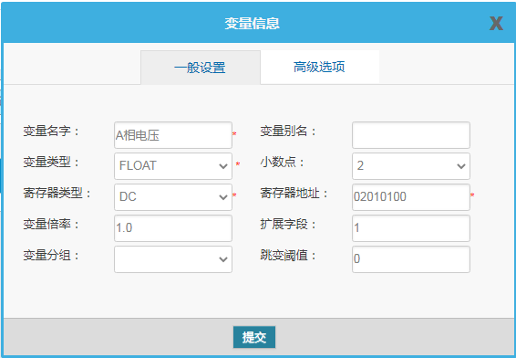 變量配置主要是定義變量名(自定義內(nèi)容,不可使用中文命名)、變量別名(自定義,可使用中文名字)、寄存器類型和寄存器偏移地址(請查閱對應(yīng)支持的數(shù)據(jù)標識),并定義一些數(shù)據(jù)規(guī)則(如:倍率、小數(shù)點、單位、告警)