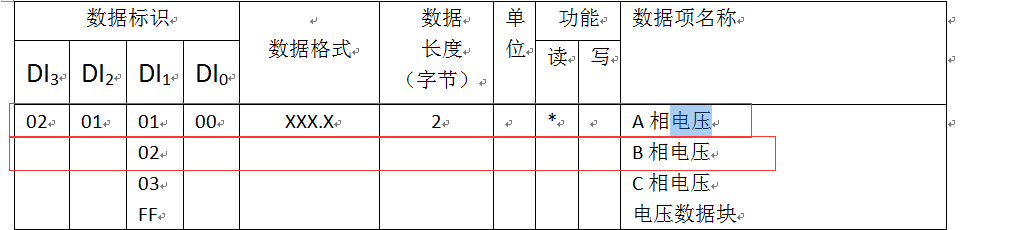 寄存器地址:查表獲取,比如DL/T645-07協(xié)議的A相電壓,查表對應(yīng)的數(shù)據(jù)標識是02010100,B相電表對應(yīng)02010200。