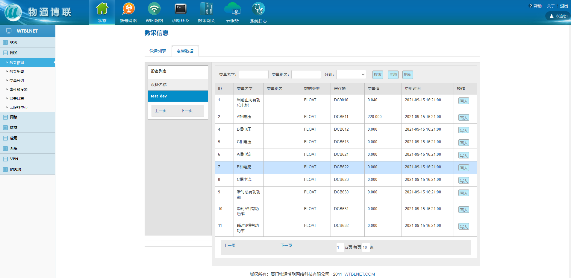 數(shù)采配置(設(shè)備信息+變量參數(shù))完成后,重啟采集程序并生效配置,即可在:數(shù)采信息---變量數(shù)據(jù)---設(shè)備名稱 中看到采集上來的數(shù)據(jù)。