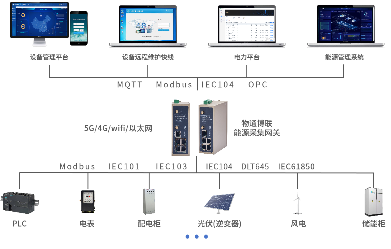 物通博聯能源采集網關可以連接水、電、氣、熱等能源設備和PLC,支持Modbus、IEC101、IEC103、IEC104、DLT645、IEC61850等協議,采集能源數據上傳到能源管理系統或數據中心進行分析和監控,實時監控各種能源設備的運行狀態和能源消耗情況,及時發現和解決能源浪費和設備故障等問題,提高能源管理效率。