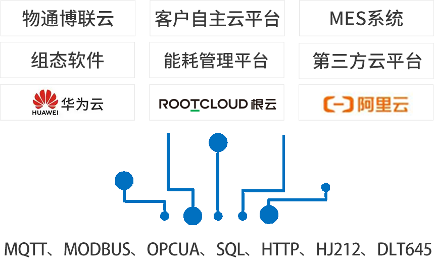 北向支持接入物通博聯云平臺,客戶自主開發的云平臺,第三方云平臺(根云、美云、華為、阿里、百度、微軟等IOT云平臺),組態軟件、MES系統、ERP系統等工業軟件