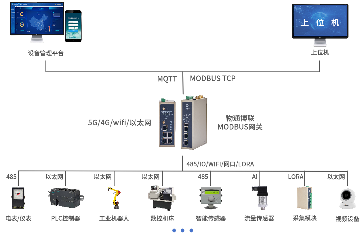 支持采集各種工控設備、PLC、傳感器、儀器儀表等設備數據,并將數據通過Modbus-TCP協議轉發給組態軟件、上位機軟件、云平臺