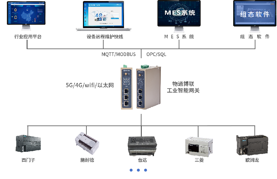 北向支持接入物通博聯云平臺,客戶自主開發的云平臺,第三方云平臺(根云、美云、華為、阿里、百度、微軟等IOT云平臺),組態軟件、MES系統、行業監控平臺等工業軟件