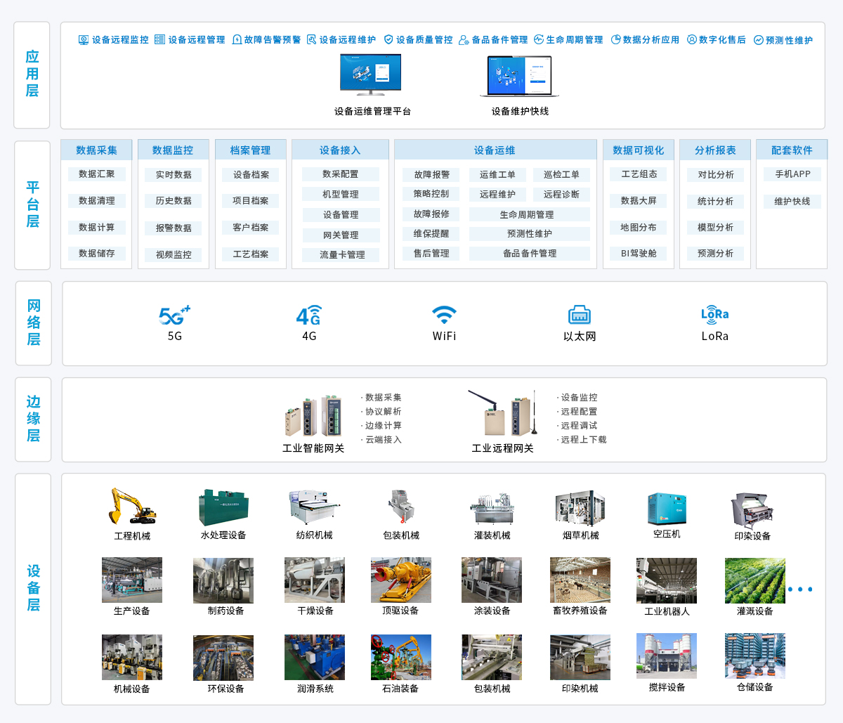物通博聯(lián)針對(duì)設(shè)備制造商的裝備數(shù)字化需求,構(gòu)建了“終端數(shù)據(jù)采集-多網(wǎng)融合傳輸-云端智能運(yùn)維-遠(yuǎn)程協(xié)同服務(wù)”的全周期技術(shù)解決方案:以工業(yè)智能網(wǎng)關(guān)為核心,采集裝備運(yùn)行參數(shù)、運(yùn)行狀態(tài)等數(shù)據(jù),通過(guò) 5G/4G/WiFi/ 以太網(wǎng)等方式將標(biāo)準(zhǔn)化數(shù)據(jù)實(shí)時(shí)上傳至設(shè)備運(yùn)維管理平臺(tái)。平臺(tái)借大數(shù)據(jù)分析與故障診斷算法,實(shí)現(xiàn)數(shù)據(jù)監(jiān)控、趨勢(shì)預(yù)測(cè)與異常識(shí)別,設(shè)備存故障風(fēng)險(xiǎn)時(shí)自動(dòng)觸發(fā)預(yù)警。依托設(shè)備維護(hù)快線,可遠(yuǎn)程完成程序上下載、參數(shù)調(diào)試等操作,提升維護(hù)效率、降低運(yùn)維成本,助力設(shè)備制造商實(shí)現(xiàn)裝備全生命周期數(shù)字化管理。