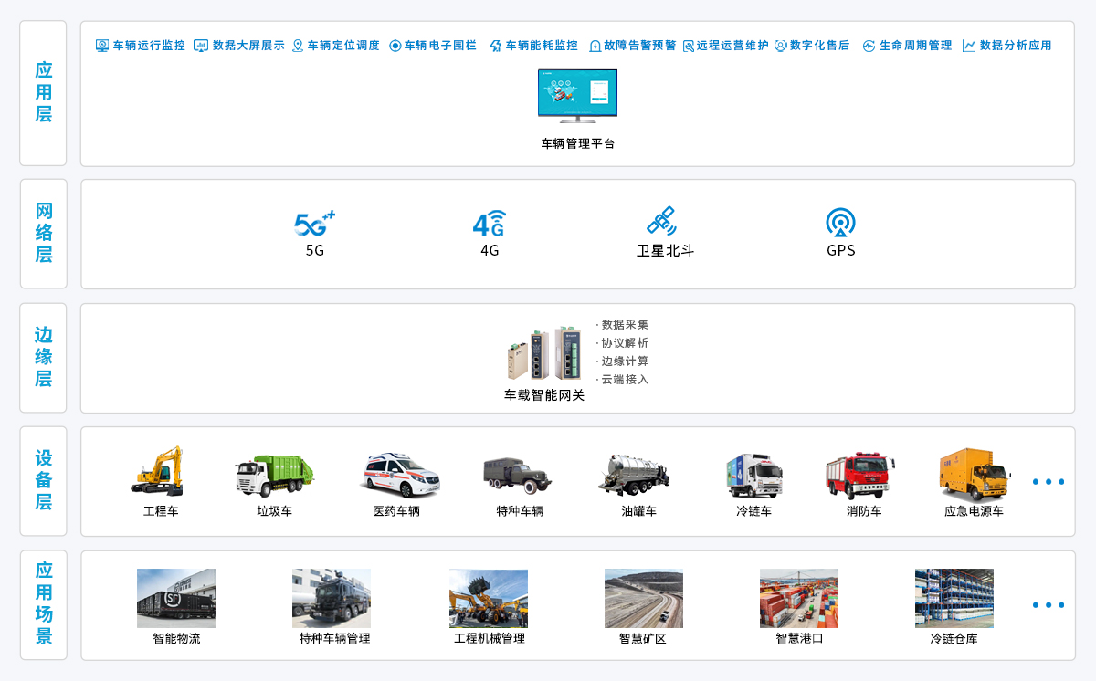 物通博聯針對特種車輛數字化需求,以車載智能網關為核心,實時采集車輛行駛參數、動力系統狀態、作業設備工況等關鍵數據,通過邊緣側本地化計算完成數據清洗、格式標準化處理。再依托 5G/4G 無線通信或北斗網絡,將標準化數據上傳至特種車輛管理平臺。平臺實現車輛位置實時追蹤、運行狀態遠程監控、異常情況及時預警,為特種車輛高效調度與安全管理提供技術支撐。