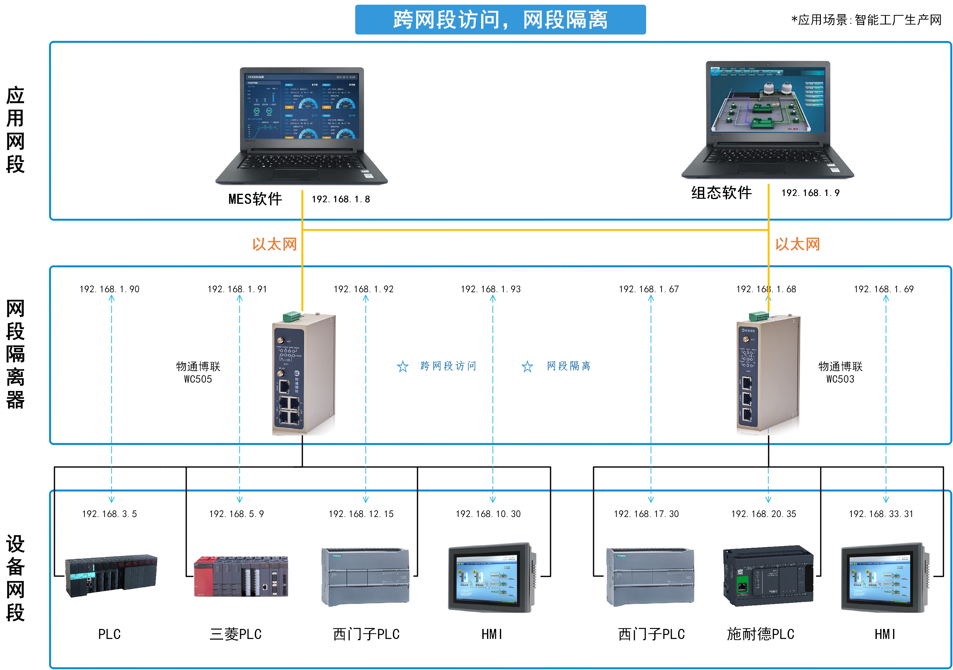 WC505網段隔離器(NAT轉換網關)適用于生產網絡對 PLC、HMI、CNC、DCS、MES等網絡通訊和數據采集,兼有跨網段隔離和IP轉換的功能。同時支持4臺以上設備(如PLC、CNC等)網段隔離和NAT 轉換;車間多個設備,如果有不同網段的IP地址,則可以統一成同一網段的IP地址,進行設備(PLC、CNC)的在線編程、數據采集、遠程管理等各種跨網段訪問。
